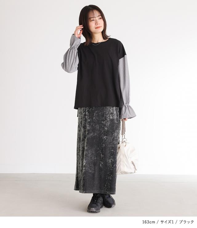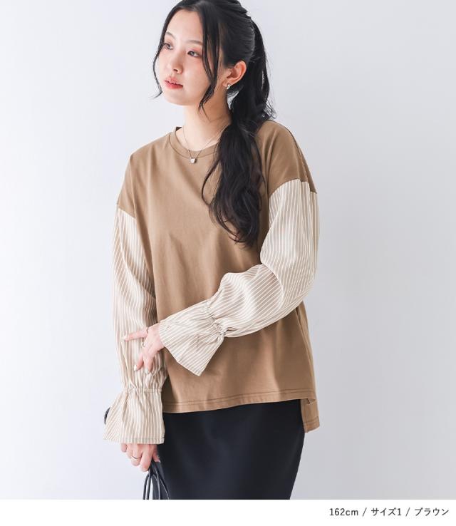 『異素材キャンディースリーブカットソー』※メール便可※【10】カットソー 長袖 レディース トップス ロンT ブラウス チュニック キャンディースリーブ 異素材 無地 ストライプ柄 綿100% きれいめ オフィスカジュアル フェミニン 大きいサイズ