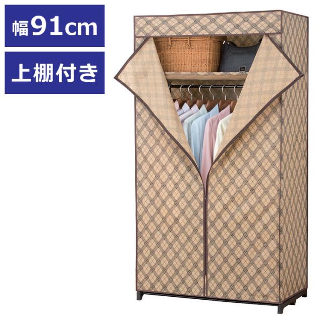 ハンガーラック カバー付き 幅91cm クローゼット 上棚付き 棚付き 通気性 不織布カバー ファスナー付き ファスナー コートハンガー クローゼットハンガー クロス柄 衣類収納 洋服 衣服 収納 出し入れ(代引不可)【送料無料】