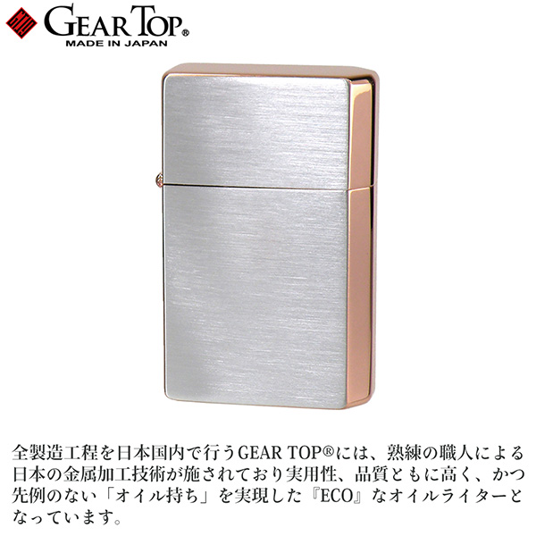 全製造工程を日本国内で行うGEAR TOP?には、熟練の職人による日本の金属加工技術が施されており実用性、品質ともに高く、かつ先例のない「オイル持ち」を実現した『ECO』なオイルライターとなっています。