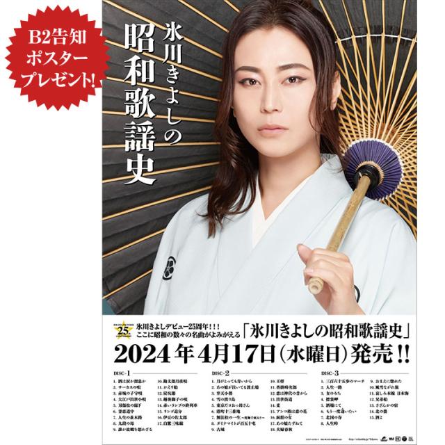 氷川きよしがデビュー25周年を迎えている歌手生活の中でレコーディングした全230曲のカバー曲より、昭和6年から昭和63年までの楽曲を本人が50曲セレクト。「氷川きよしの昭和歌謡史」と題し、昭和を彩ってきた数々の名曲を年代順にまとめて、新ビジュアルで発売。驚くべき歌唱力とその心地よい歌声で、聴く人の心を魅了し続けるの宝箱のようなアルバムです。