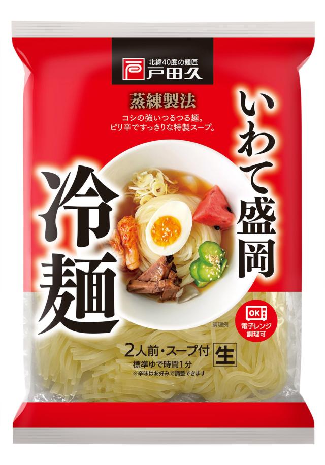 盛岡を代表する、独特の蒸練製法でコシを出した麺です。特製スープとキムチの素を添付しました。麺はそば粉不使用の透明感がありコシがある「盛岡冷麺」で「本場名産品」基準を満たした認定品です。今期よりスープを見直し、コクとうま味を増すように、かつお節エキス・肉エキスを追加しました。
