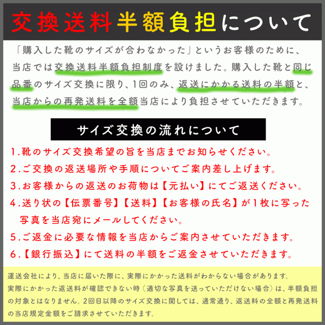 購入した靴と同じ品番のサイズ交換に限り、1回のみ、返送にかかる送料の半額と、当店からの再発送料を全額当店により負担させていただきます。