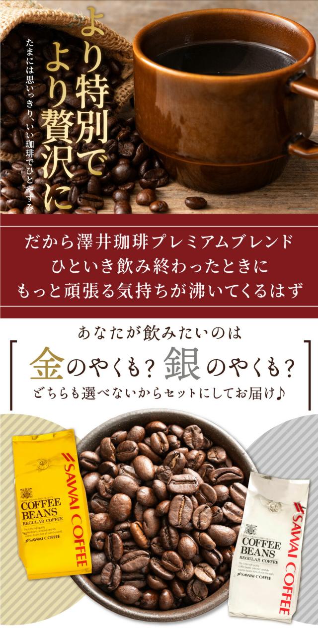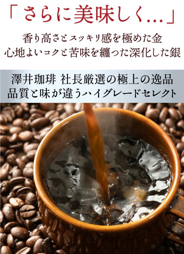 | こんな方にオススメです | 飲み比べを楽しみたい方へ:金と銀の2種類の味わいが飲み比べでき、合計160杯分も楽しめます。毎日のコーヒータイムをバラエティ豊かに楽しみたい方に最適です。 新鮮なコーヒーが好きな方: 澤井珈琲は焼きたてコーヒー専門店だから、いつでも新鮮な味を楽しめます。 家族やオフィスで飲む方: 大容量のパッケージなので、みんなで楽しめます。 |