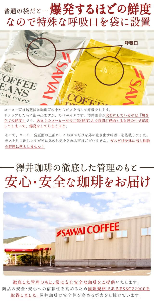 澤井珈琲(さわいこーひー)では、お客様のお家に商品が届き、箱を開けた瞬間。そして、トレードマークの赤いコーヒー袋の封を開けた時に鮮度抜群の「香り高さ」と、飲んだときの「味わい」に感動して頂けるように、レギュラーコーヒーはご注文を頂いてから焙煎をして焼きたてのコーヒー、コーヒー豆、珈琲、珈琲豆をお届けをしている焼き立て珈琲専門店です。お客様に「美味しい」と言って喜んで頂く事が私たちの喜びと思っております。「美味しいコーヒーをお届けしたい」と想い続けて生まれたこだわりの味を、どうぞ、この機会にお楽しみくださいませ。澤井珈琲では、コーヒー豆は挽き方がご選択いただけます。珈琲豆を挽く事をお楽しみ頂ける『豆のまま』や、私共の専用の特注サイズの大型のミルで挽いて、コーヒー粉の状態にしてお届けする方法がございます。中挽き、細挽き、粗挽き、荒挽きなど様々な挽き方がございますが、私共がお薦めする『店長のおすすめ挽き』にて、そのコーヒーに合った一番美味しいと思える挽き方に挽いてお届けします。東京の銀座にも実店舗を構える安心安全な澤井珈琲で楽しいお買い物をお楽しみください。よく間違えられる名前として、沢井珈琲、沢井コーヒー、澤井珈琲店、澤井珈琲本店、さわいこーひー、サワイコーヒーなどがございますが、正式名称は澤井珈琲となります。