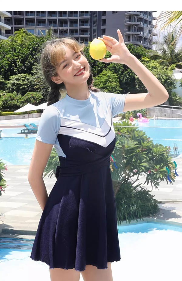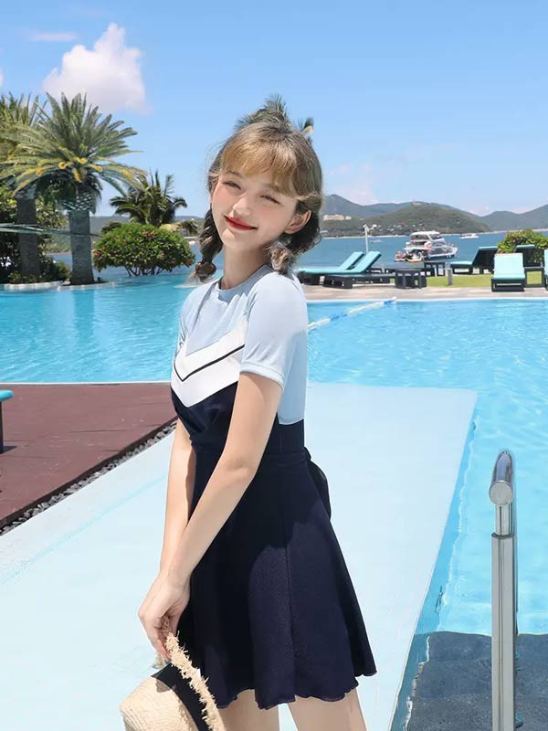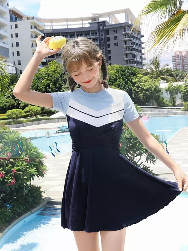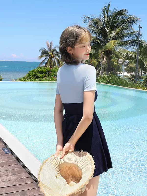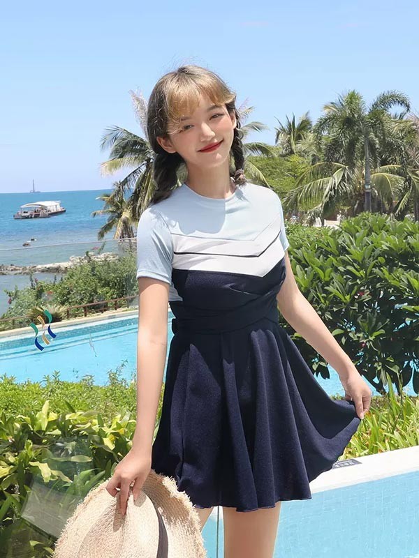 ワンピース水着 服みたいな 水着 2点セット 半袖 無地 切り替え ワイヤーなし パッド付 レディース 着?せ シンプル セクシー 露出控えめ 写真映え 撮影用 海 夏 サマー プール リゾート かわいい 旅行 温泉 大人 女性用 ジュニア 学生 女の子 ネイビー ブルー