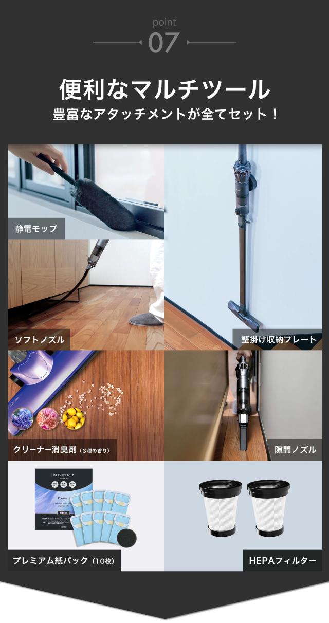 | A, | 延長パイプ+ヘッド、充電アダプター、壁掛け収納プレート一式、隙間ノズル、ソフトノズル、HEPAフィルター(交換用)×2、紙パック×10、期間限定紙パック、静電モップ、モップホルダー、クリーナー消臭剤、取扱説明書になります。 |