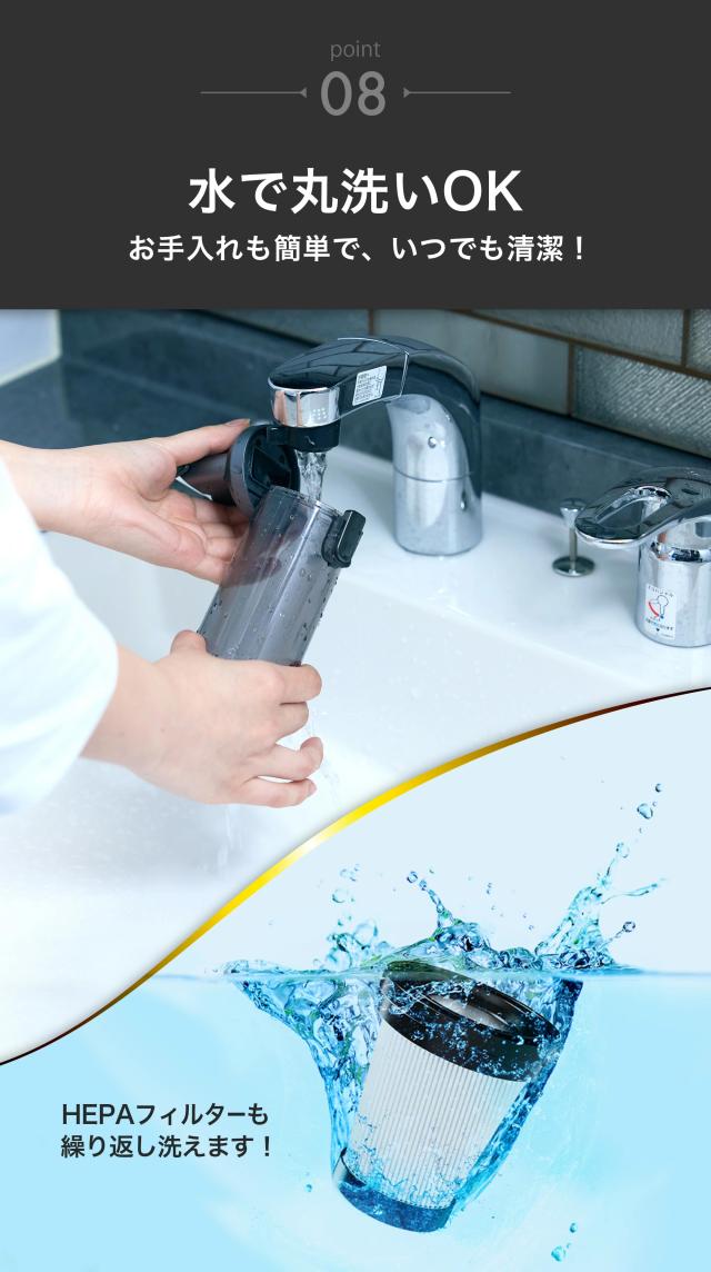 | A, | ダストカップ、メッシュフィルター、HEPAフィルター、隙間ノズルは水洗いが可能です。水洗い後、1日程度乾燥させてからご使用ください。水洗いができないパーツは、布等を使用して汚れを拭き取ってください。 |
