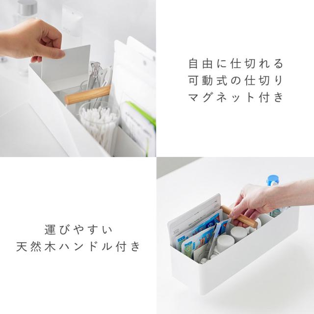 小物の収納に便利な、ハンドル付きのスリムなボックス。マグネット付きの可動式仕切りは、自由に仕切ることができるので小物やシートマスク、湿布なども収納しやすく便利。
