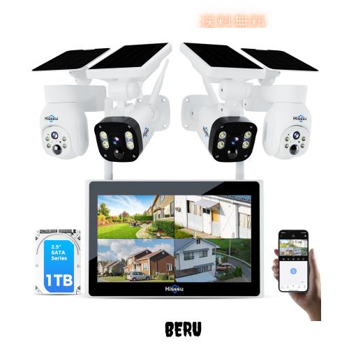 【400万画素・360° PTZ機能搭載・電源不要】Hiseeu ソーラーパネルカメラ セット 10インチLCD液晶モニタ一体型NVR 8000mAh 遠隔監視 防