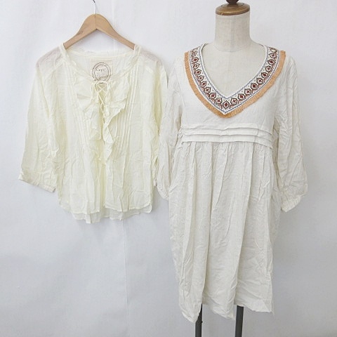 【中古】未使用品 セポ CEPO ワンピース ブラウス 2枚セット 膝丈 七分袖 Vネック プルオーバー フリル ベージュ アイボリー M