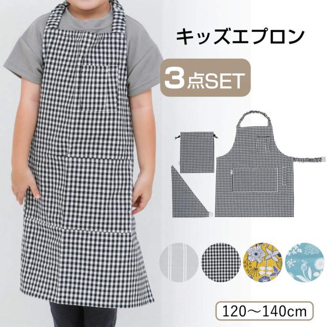 《 LH12957 キッズエプロンセット 子ども用 バンダナ 巾着 袋 収納袋 ポケット 子供 こども 幼児 園児 小学生 低学年 高学年 中学生 小学生サイズ お料理教室 家庭科 給食 お手伝い お絵かき 料理教室 お菓子作り 男児 女児 可愛い カワイイ お洒落 オシャレ かっこい カッコイイ プレゼント ギフト 贈り物 御祝い お祝い 入園祝い 入学祝い 進級祝い 誕生日 入園準備 入学準備 キッチン用品 120〜140cm対応 120cm 130cm 140cm ストライプ ギンガムチェック ボタニカル 花 ぐれー 灰色 ぶらっく 黒 くろ いえろー 黄色 きいろ ぶるー 青 あお 》