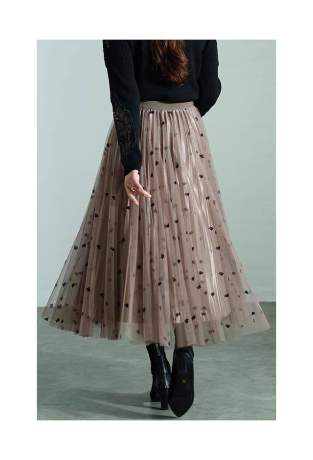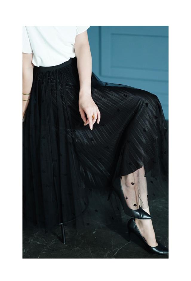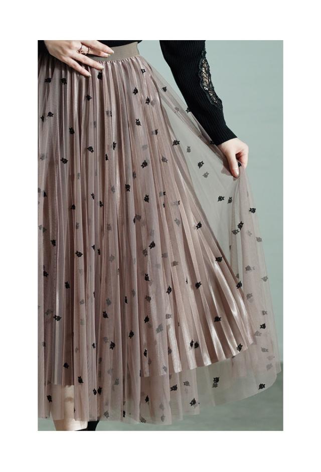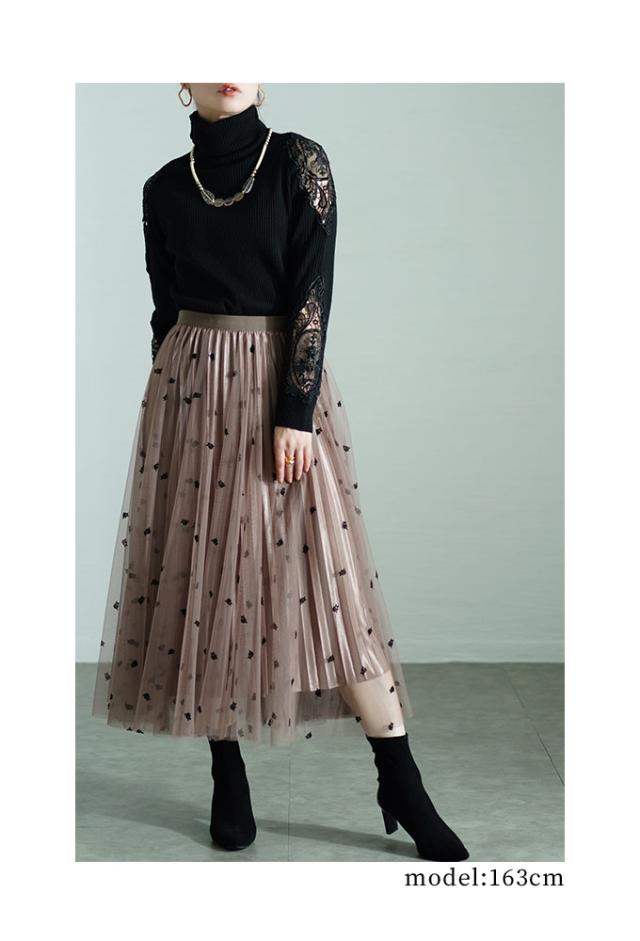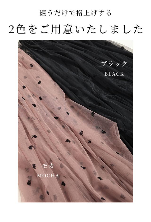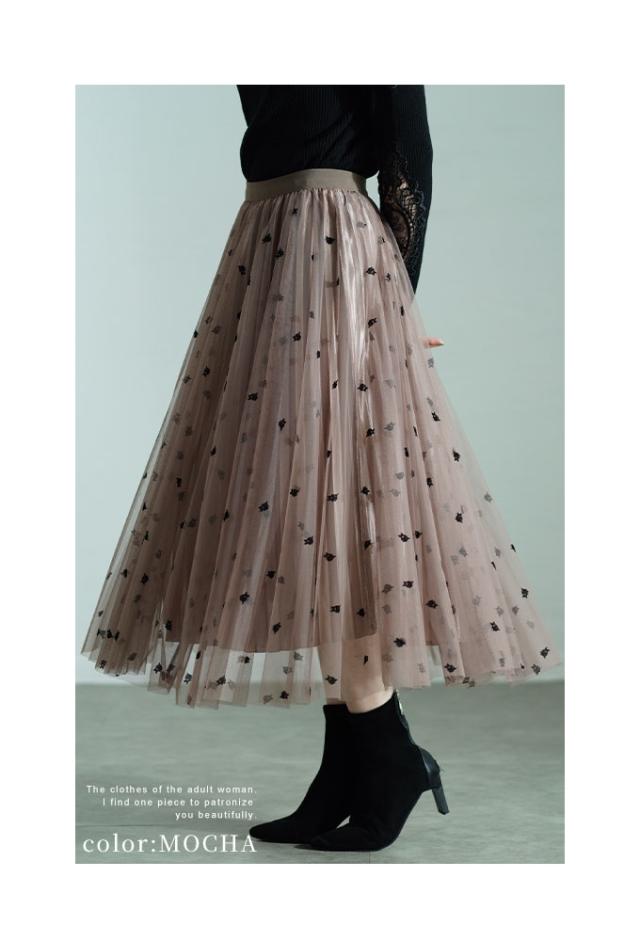 冬新作 贅沢を奏でるような花柄ドットチュールスカート レディース ファッション スカート 花柄 ドット チュール プリーツ フレア サテン ブラック モカ 春 秋 30代 40代 50代 60代 サワアラモード sawaalamode otona 大人 cawaii 可愛い 洋服 かわいい服 sawa-9655