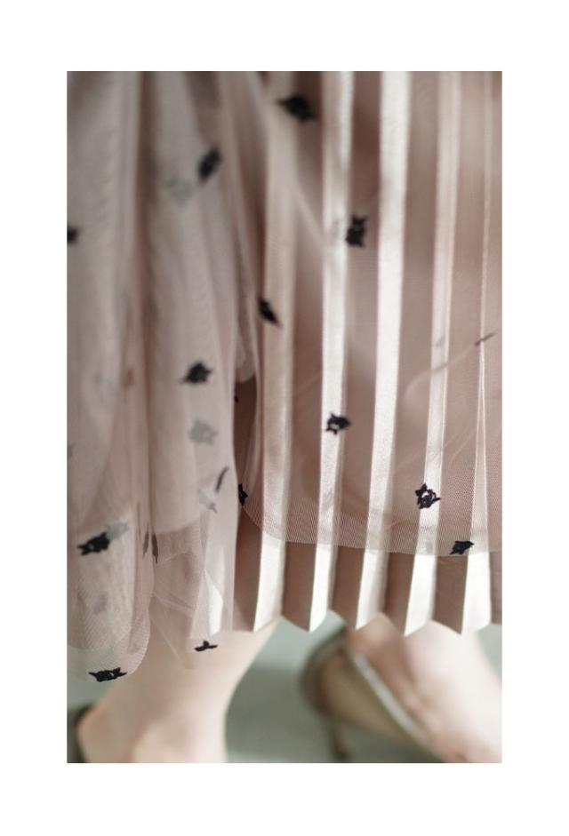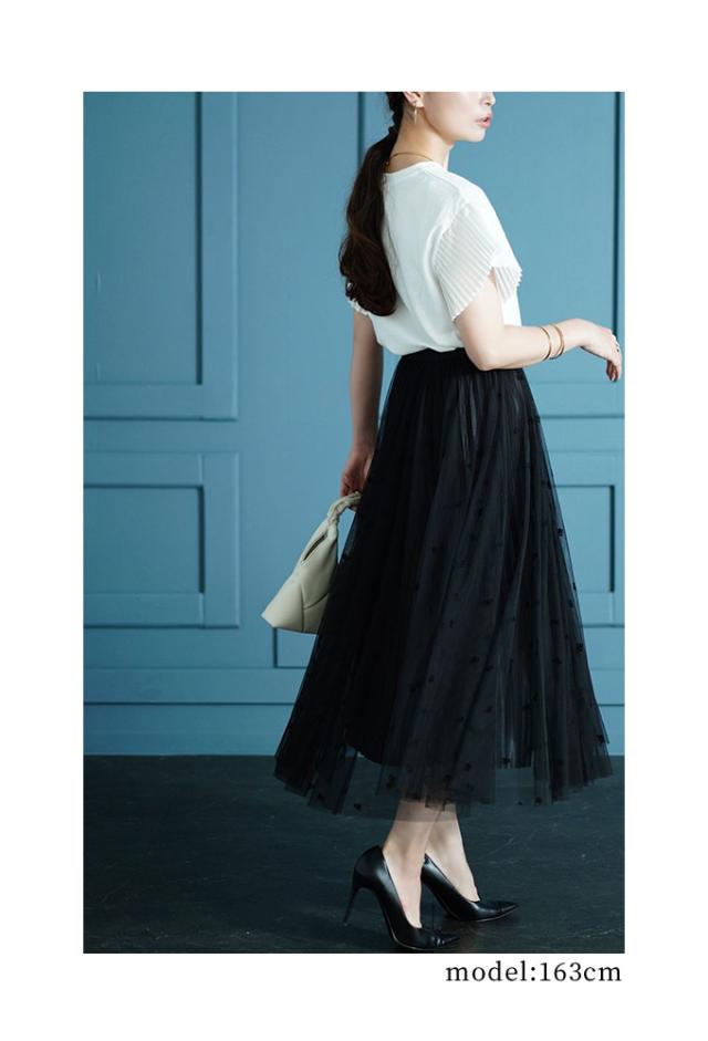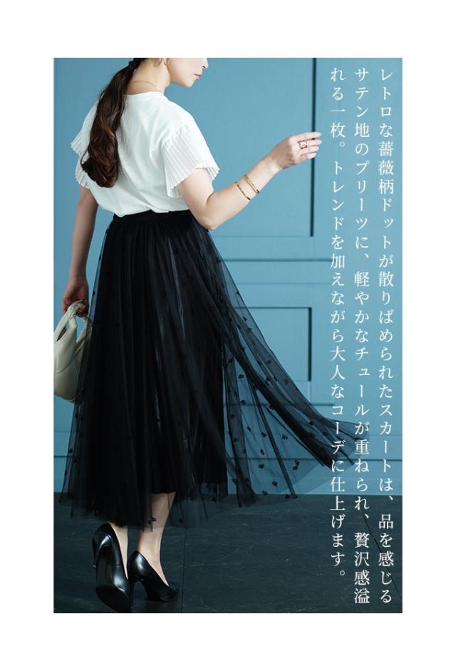 特徴: 薔薇柄 花柄 ドット チュール プリーツ サテン 光沢 異素材 透け感 ウエストゴム フレア