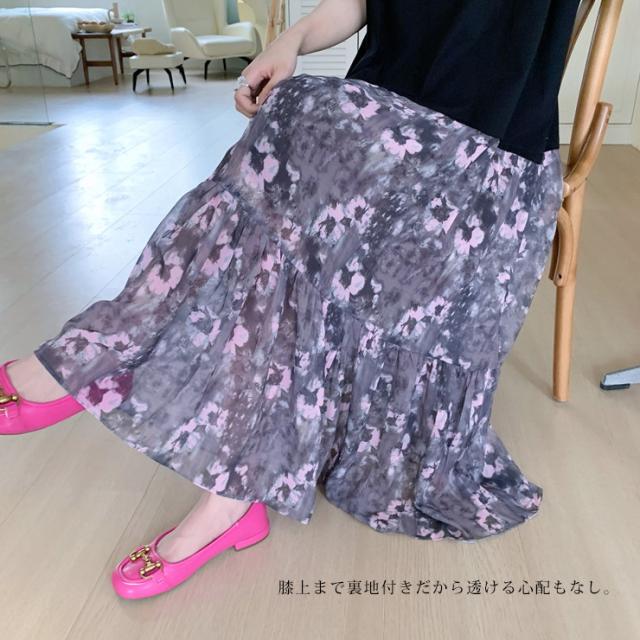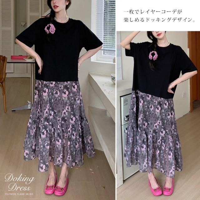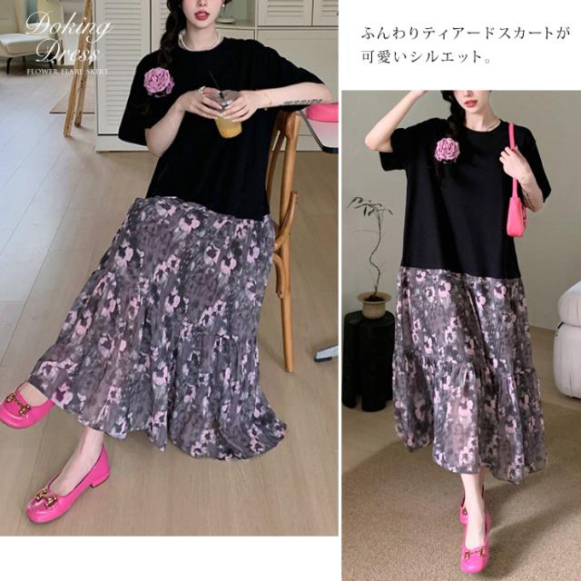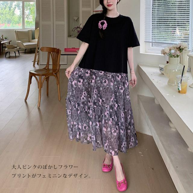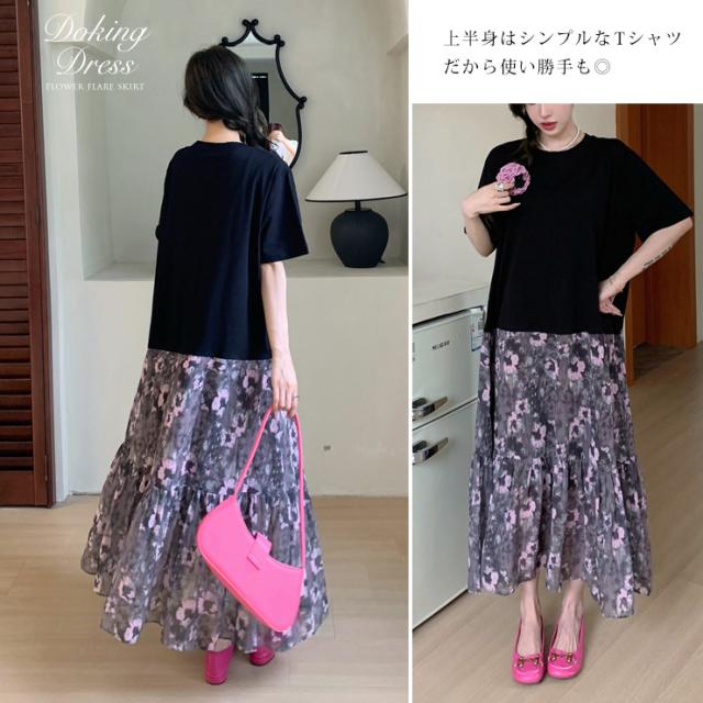 大きいサイズ レディース ドッキングワンピース 半袖Tシャツ 花柄スカート コーデ ロング丈 夏 L LL 3L 4L (hm6426)