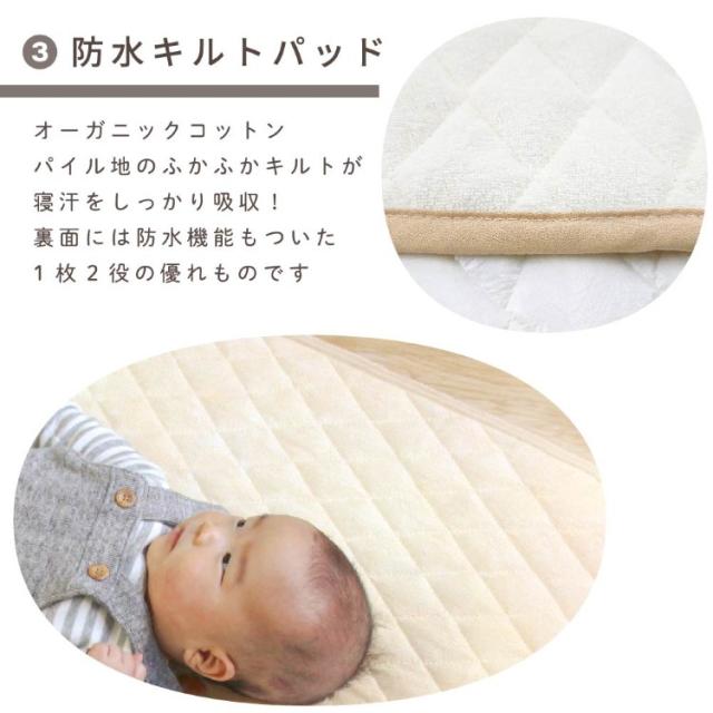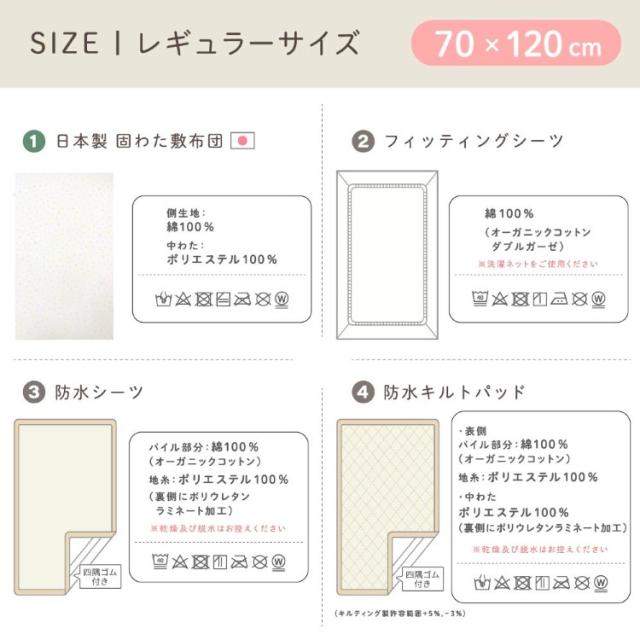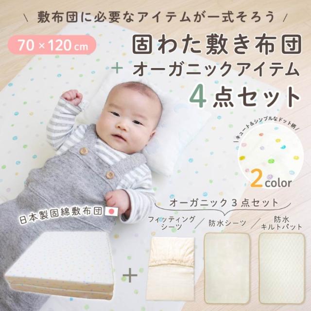 日本製固綿敷布団とお肌にやさしいオーガニックアイテム(フィッティングシーツ/防水シーツ/防水キルトパッド)がセットになりました。ねんねに最低限必要なアイテムがそろっているため、好みに合わせて買い足してカスタマイズすることも。