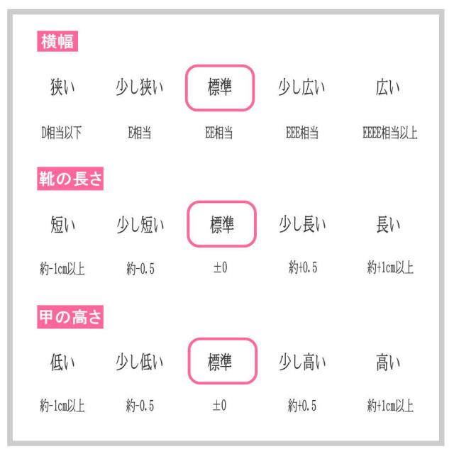 23.0cm(約26.5cm)/23.5cm(約27.0cm)/24.0cm(約27.5cm)/24.5cm(約28.0cm)