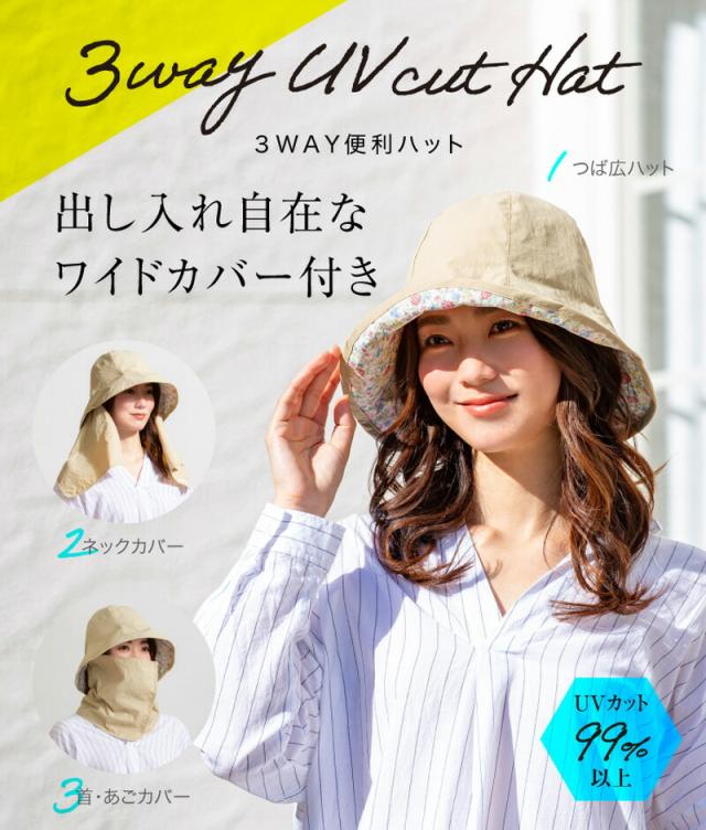 3WAY便利ハット UVカット帽子 uv 帽子 つば広 深め 紫外線対策 紫外線カット帽子 レディース 小顔 UVカット 夏 フェイスカバー 日焼け対策 首 顔 日焼け防止 紫外線 防止 幅広つば レディース帽子 おしゃれ かわいい 折りたたみ つば広帽
