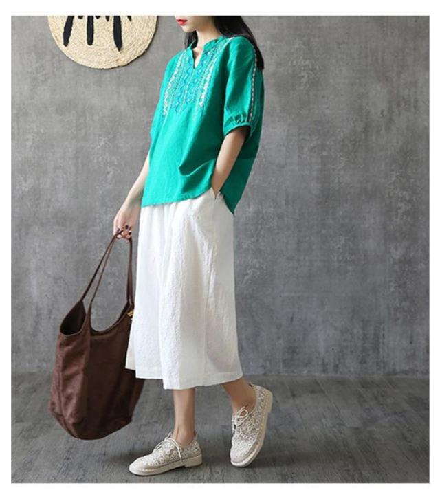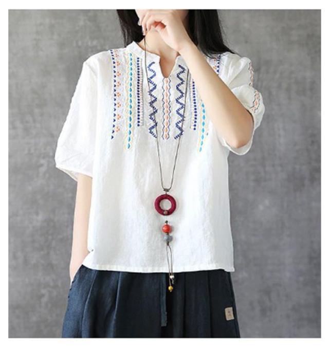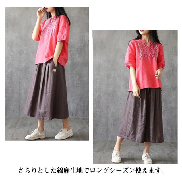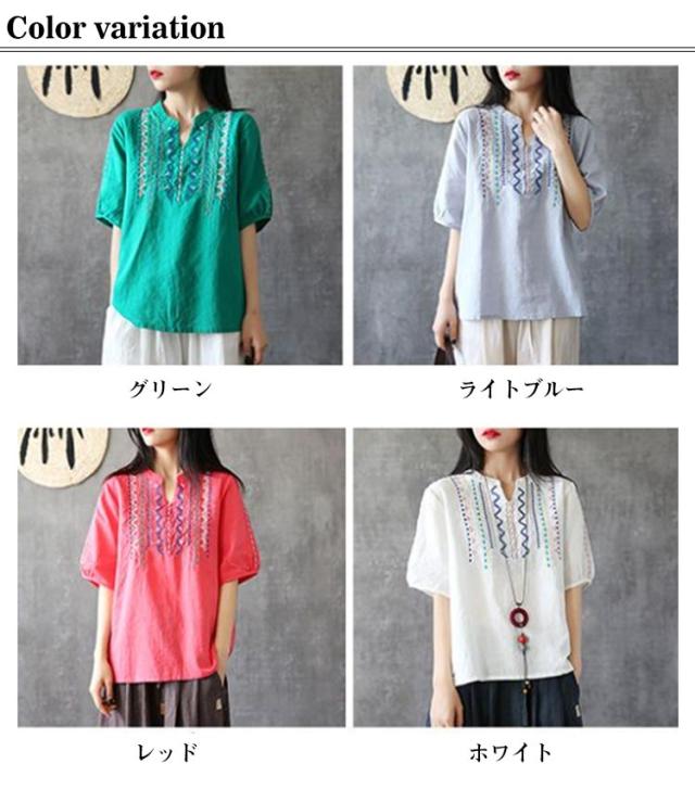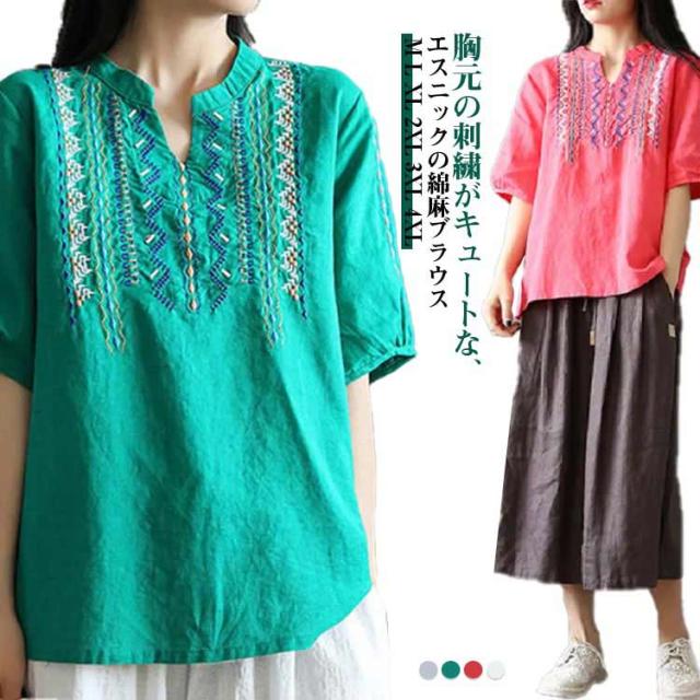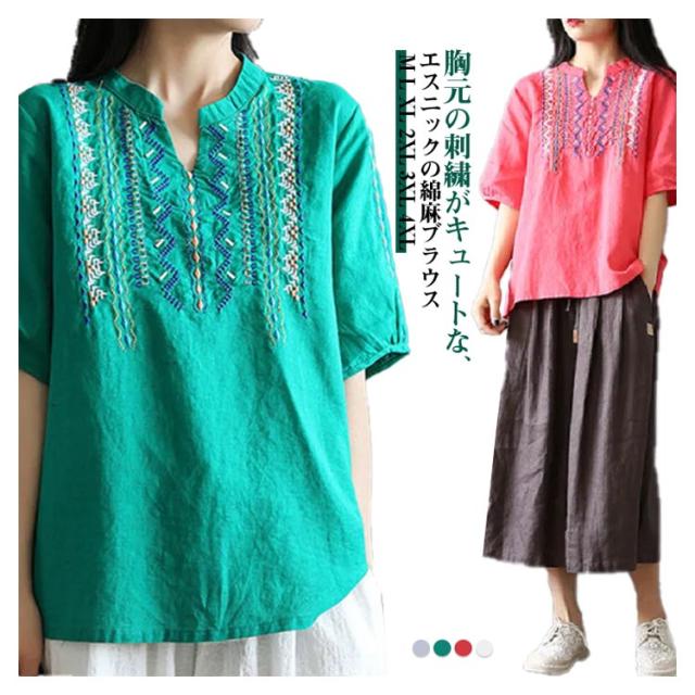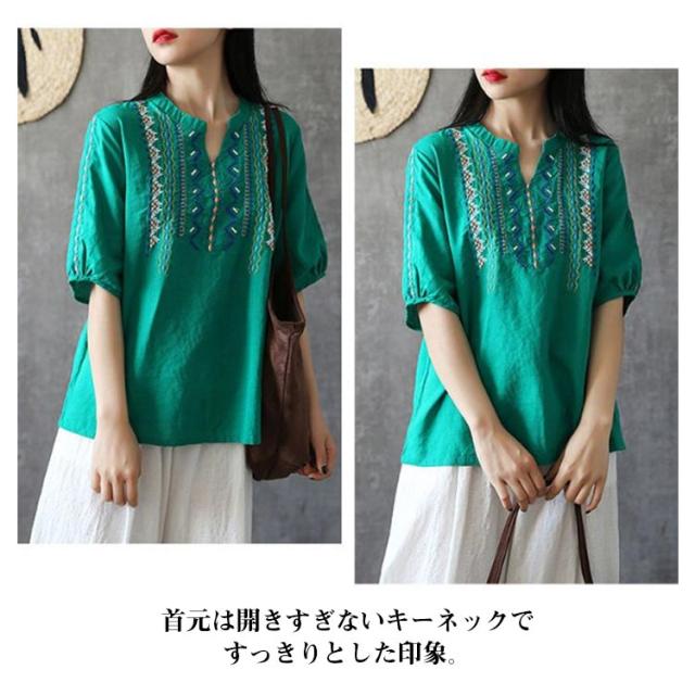 カットソー 綿麻チュニック 森ガール 5分袖 トップス 綿麻ブラウス シャツ 夏 ブラウス 刺繍 レディース スキッパー 大人女性 半袖 エスニック 綿麻ブラウス プルオーバー 刺しゅう チュニック オーバーサイズ 体型カバー