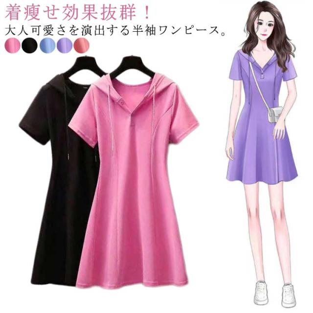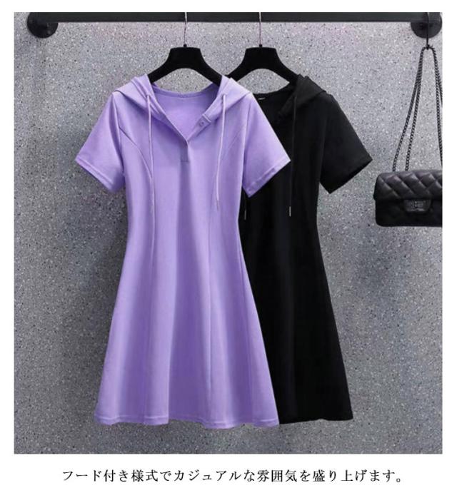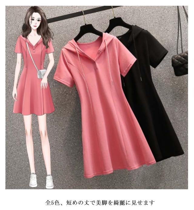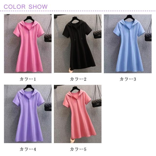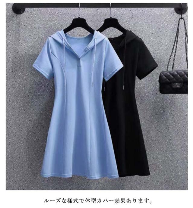 | 着?せ効果抜群!大人可愛さを演出する半袖ワンピース。 フード付き様式でカジュアルな雰囲気を盛り上げます。 全5色、短めの丈で美脚を綺麗に見せます ルーズな様式で体型カバー効果あります。 | |