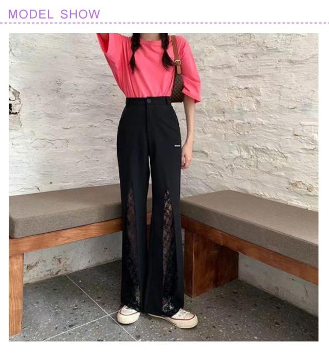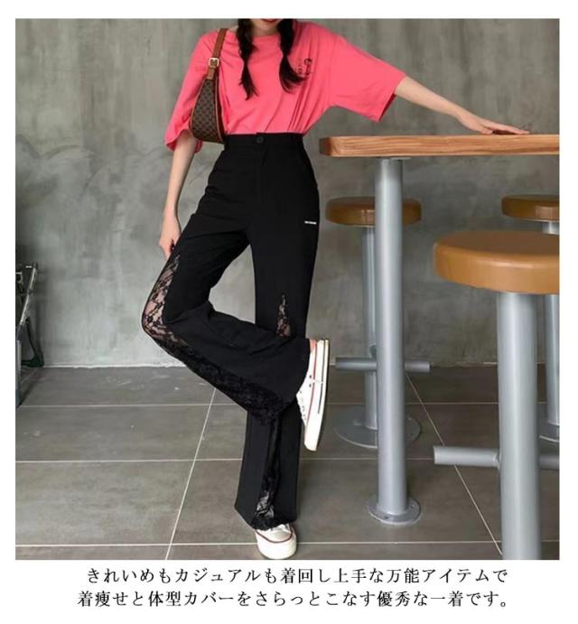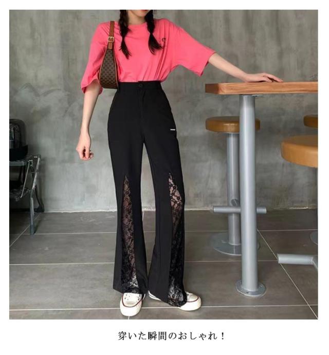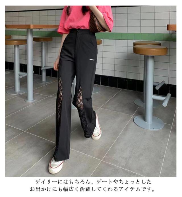 ロングパンツ セクシー ワイドパンツ ベルボトム シースルーレース 切り替え フレアパンツ 美脚パンツ レディース おしゃれ 体型カバー パンツ 大人 可愛い 細身 黒 2XL カジュアル 透かし編みレース かわいい S M L XL 脚長