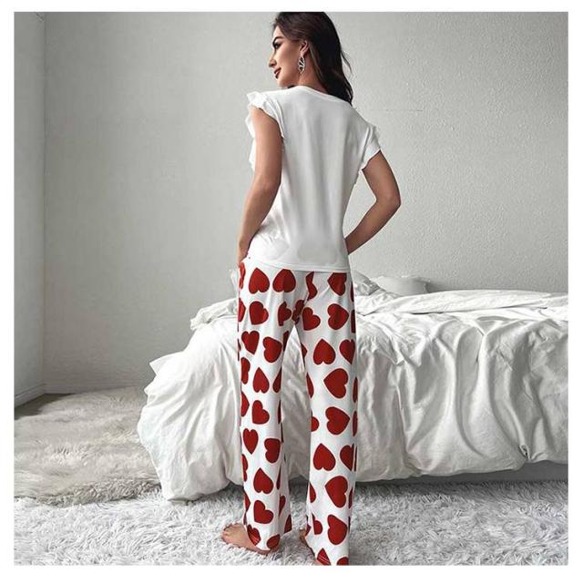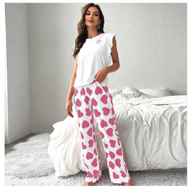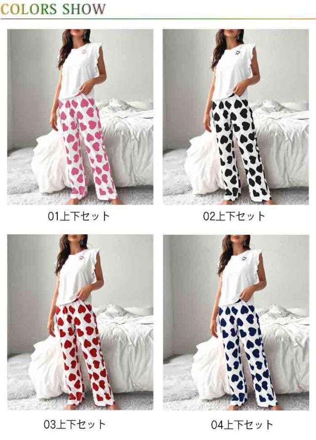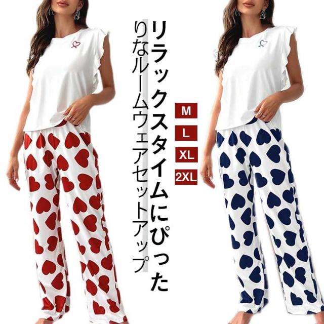 パジャマ 上下セット ルームウェア フリル袖 半袖 ハート柄 ロングパンツ セットアップ ルームウェア かわいい 部屋着 ナイトウエア 母の日 ギフト