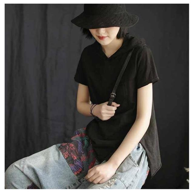 綿 tシャツ 大きいサイズ おしゃれ カットソー 半袖tシャツ フード付きtシャツ レディース プルオーバー 薄手パーカー フード付き ダメージ加工 クラッシュ トップス ホワイト ブラック 春服 夏服 半袖 長袖 シンプル フード付き
