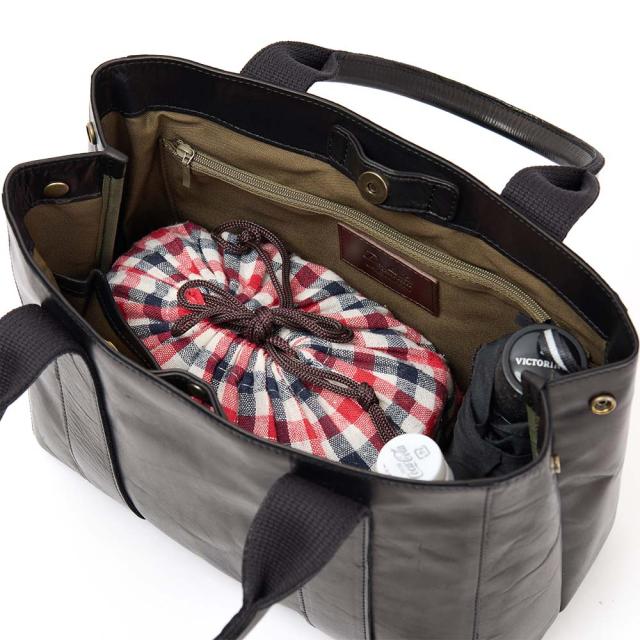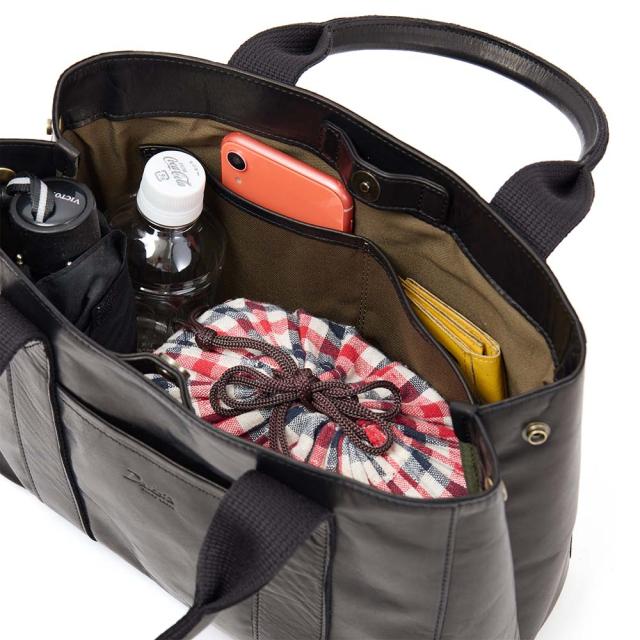 500mlボトルや長財布が縦横どちらでも収納できるミニトート。B5くらいのサイズ感ですが、両サイドのホックを外すマチが広がるので、よりゆったりと収納できます。