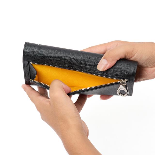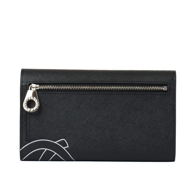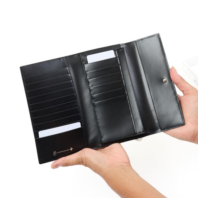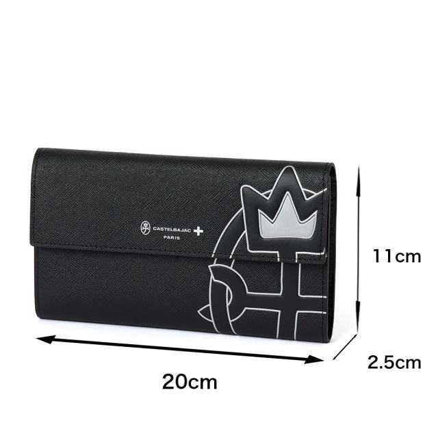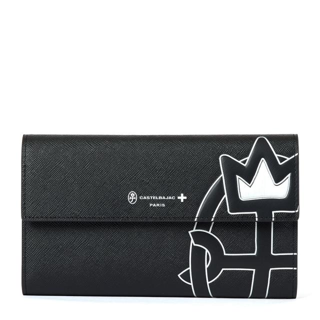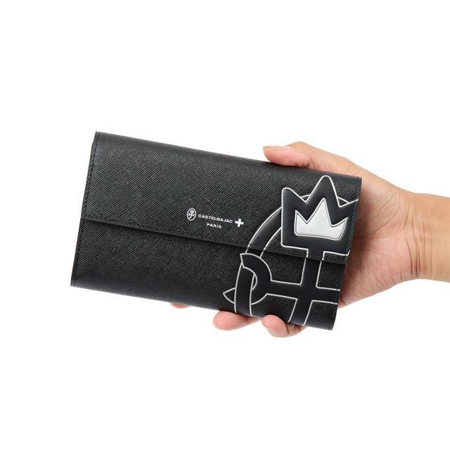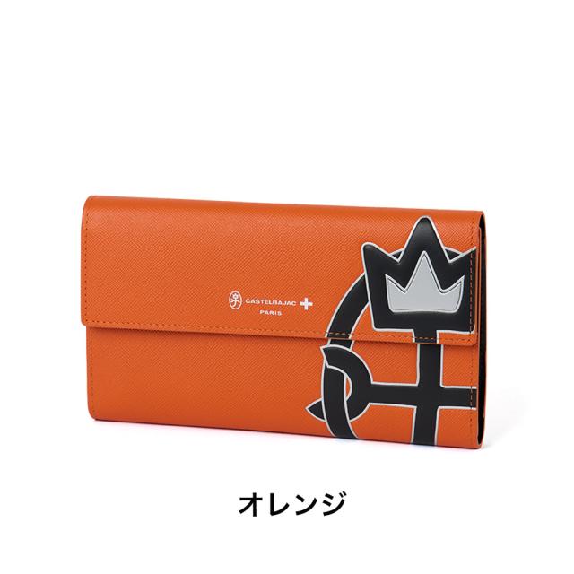 枠からはみ出たようなブランド家紋デザインが特徴の、カステルバジャックのかぶせ長財布。ブランド家紋の王冠部分がシルバーになっており、目を引くアクセントとなっています。