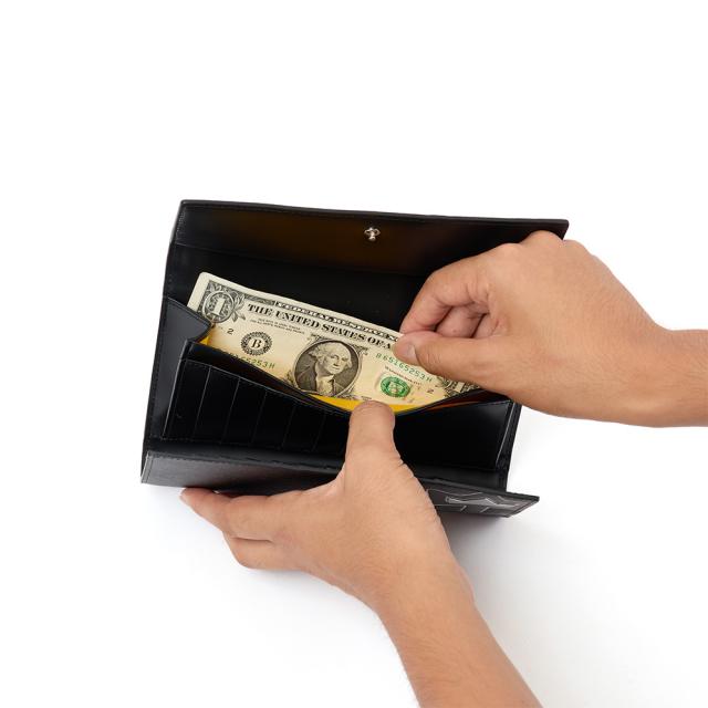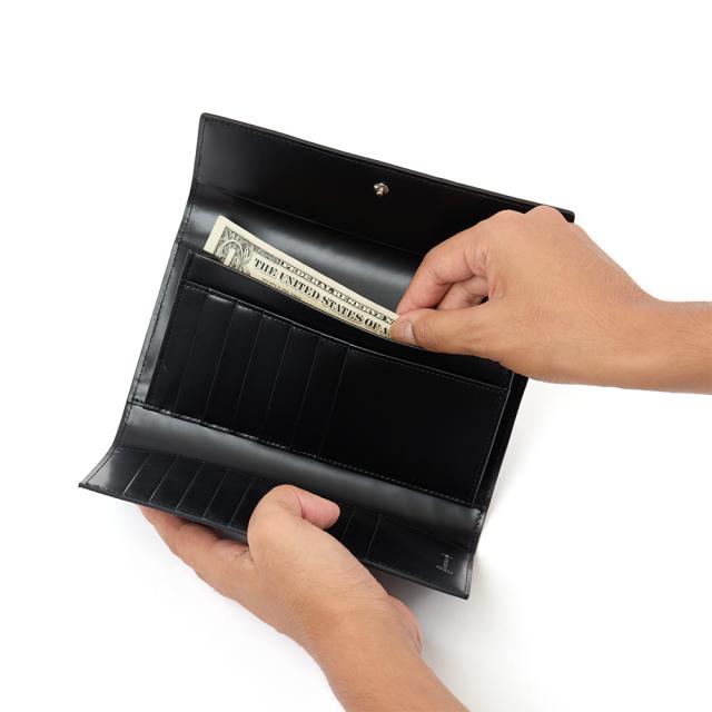 かぶせタイプの長財布を開くと、札入れが1つ、カード段が16、ポケット大が2つあります。背面にファスナー小銭入れがございます。