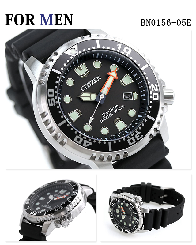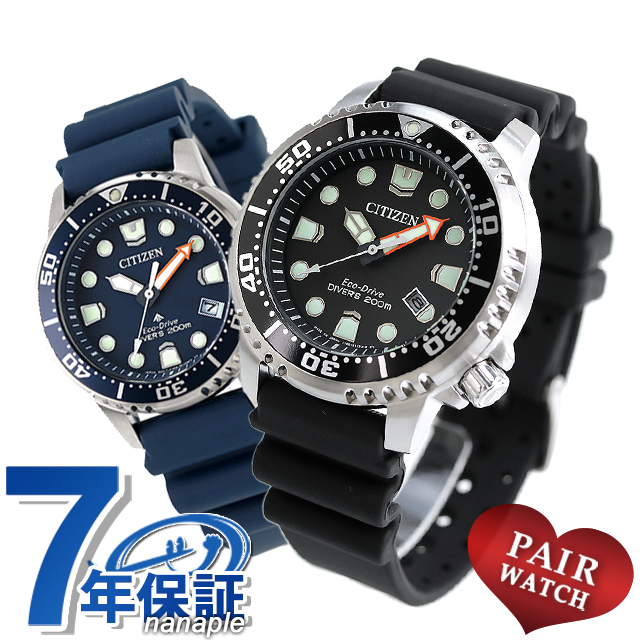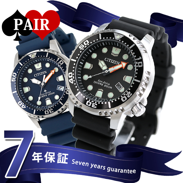 正規品 7年保証キャンペーン 送料無料 ペアウォッチ シチズン プロマスター エコ・ドライブ メンズ レディース 腕時計 pair-citizen103 CITIZEN PROMASTER アナログ ブラック ネイビー ◆機能性、耐久性、安全性を兼ね備えた本格スポーツウオッチ、シチズン PROMASTER(プロマスター)。どれだけ潜っても届くことのない深い海の底へ。メンズモデルは、水中や暗い場所でも表示が見やすい夜光仕上げの針とインデックス、誤作動を防ぐ逆回転防止ベゼル、ねじロックりゅうずなど、ダイビング中の安全性を考慮した本格機能を搭載しています。腕への装着性を考慮し、手首に干渉しづらい4時位置にりゅうずを配置。カレンダーも4時位置に配置することで12・3・6・9時の重要なポイントの視認性を高めています。レディースモデルは、200m潜水用防水のケース径約37mmのボーイズサイズ。ISO規格をクリアした本格的なダイバーズウオッチです。 メンズ品番:BN0156-05E レディース品番:EO2021-05L