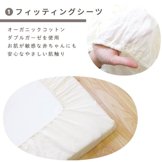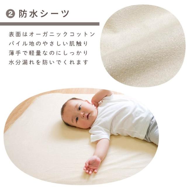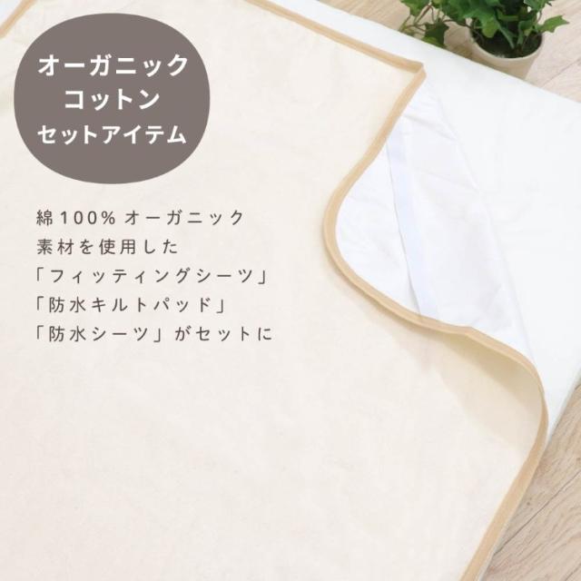 日本製固綿敷布団とお肌にやさしいオーガニックアイテム(フィッティングシーツ/防水シーツ/防水キルトパッド)がセットになりました。ねんねに最低限必要なアイテムがそろっているため、好みに合わせて買い足してカスタマイズすることも。
