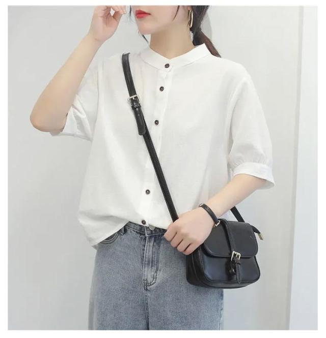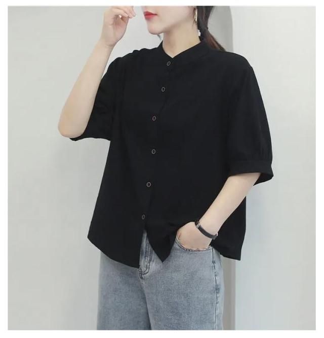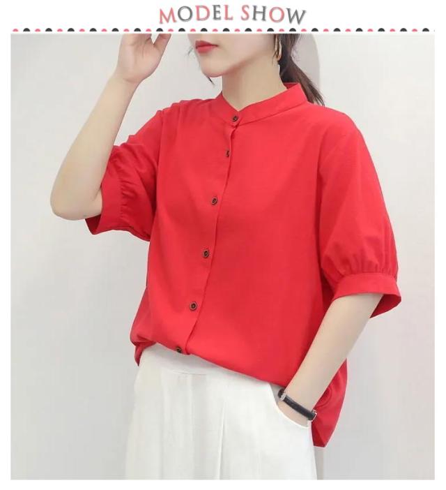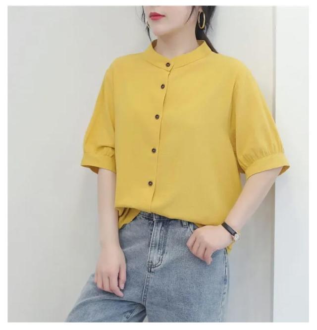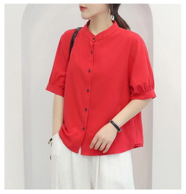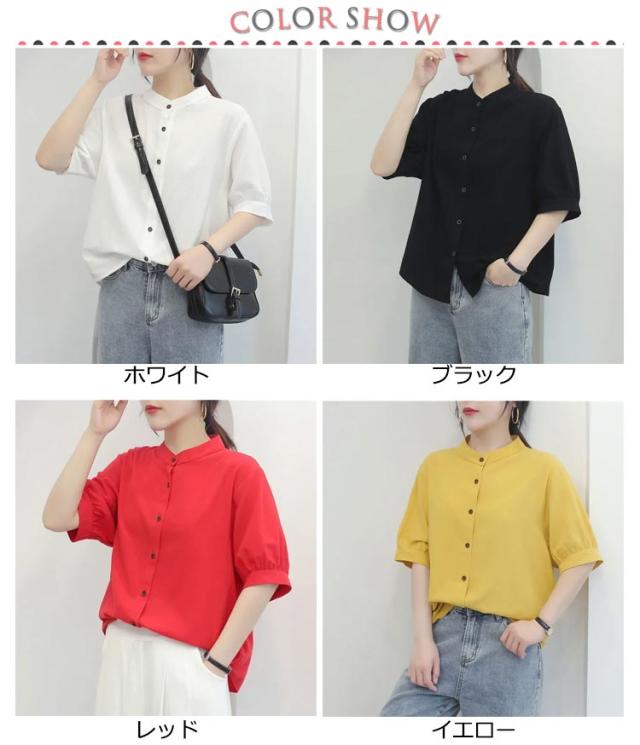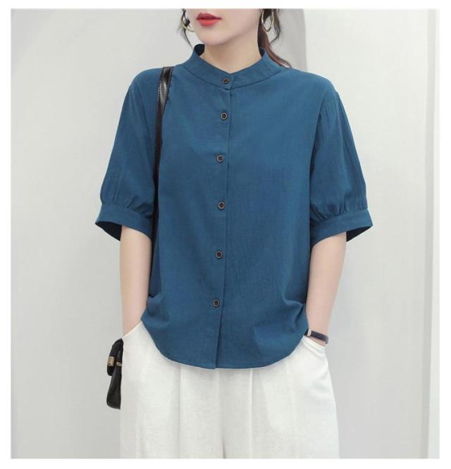コットンシャツ レディース ブラウス 半袖 ブラウス 綿麻 シャツブラウス 5分袖 コットンシャツ 大人可愛い 夏 春秋 無地 シンプル トップス シャツ ノーカラー ドット柄 可愛い たち襟 前開け コットン 通気性 柔らかい ゆったり