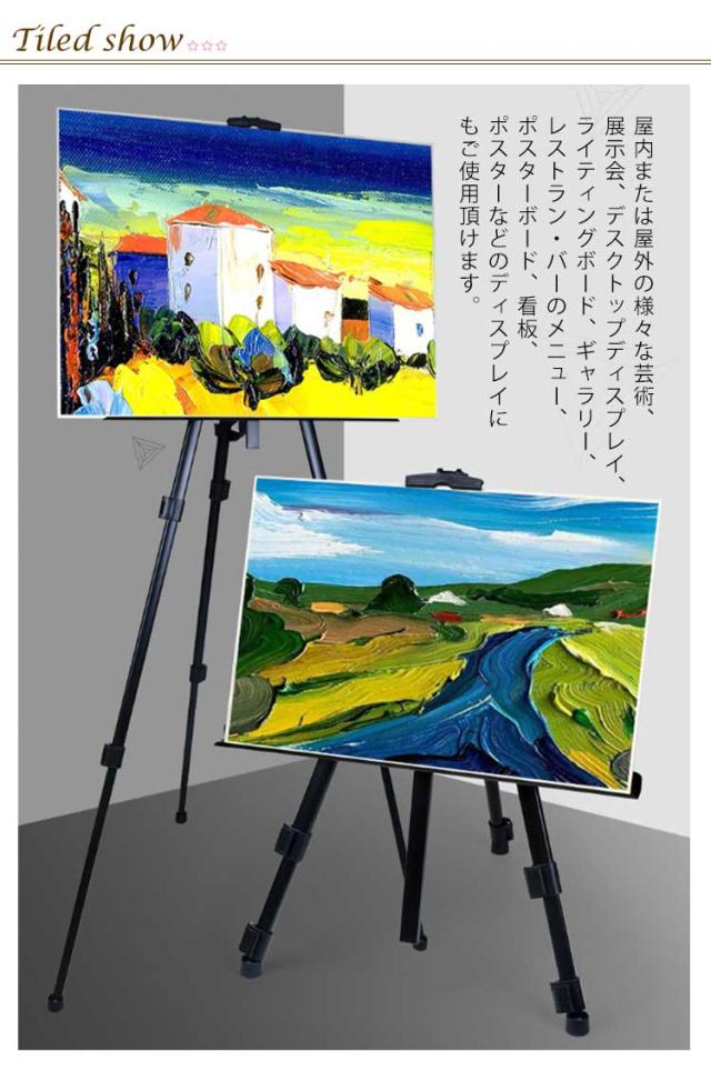 | 3段 折りたたみ 携帯型イーゼル B2縦置 屋内または屋外の様々な芸術、展示会、デスクトップディスプレイ、ライティングボード、ギャラリー、レストラン・バーのメニュー、ポスターボード、看板、ポスターなどのディスプレイにもご使用頂けます。 軽量コンパクトで収納袋が付いてますので持ち運びにも便利です。 広いスタンドが付いているので、掲示物がぐらぐらすることも無く、安定性も優れております。 絵画やボードの高さに合わせて簡単に調整可能。 接地部分は滑り止めキャップ付き、不安定な地面でも確実な安定性を提供します。 | |