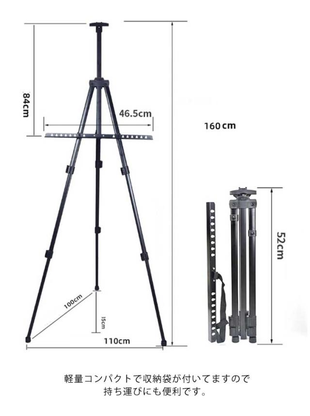 | サイズについての説明 | 最大設置高さ:160cm 枠内高さ:約83cm(横置きでF40号、縦置きでF25号) 枠内厚さ:約2.5cm 収納時:56cm |