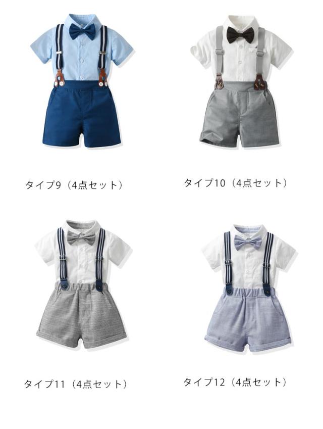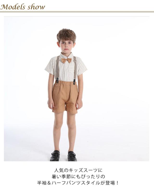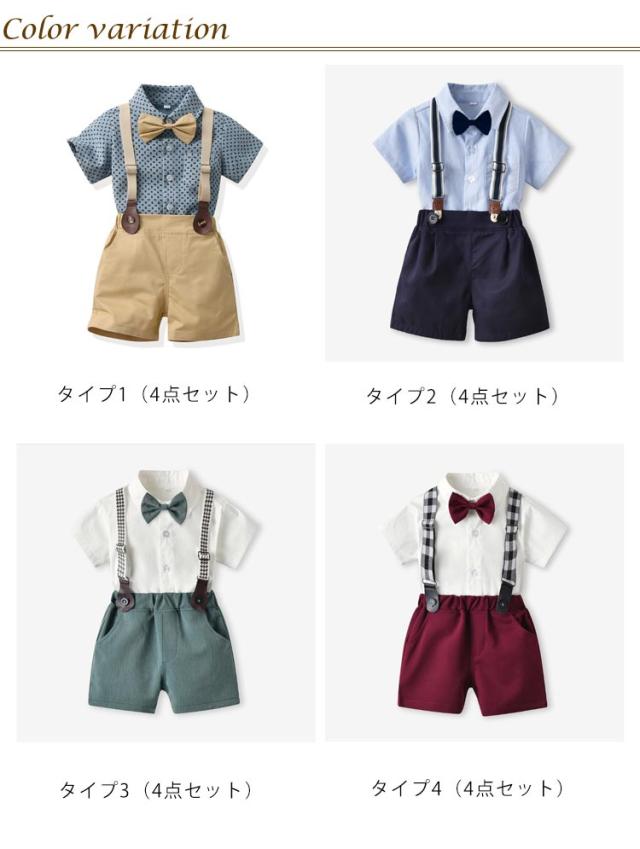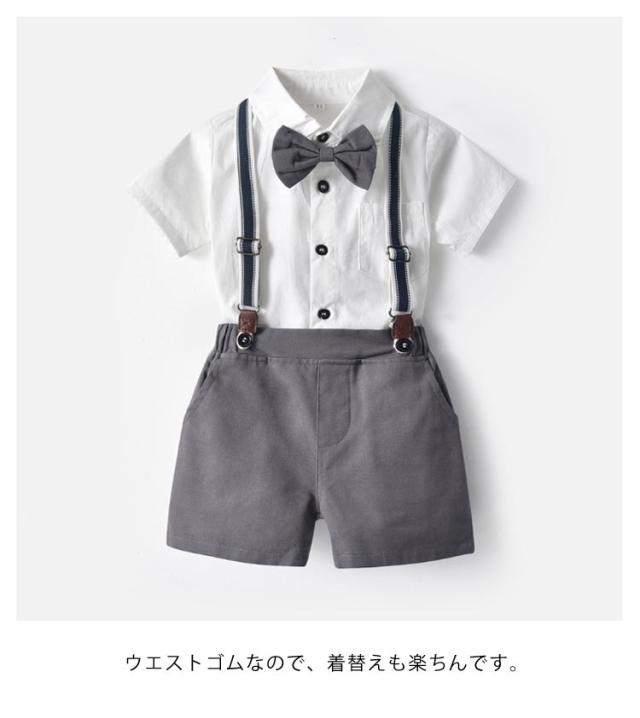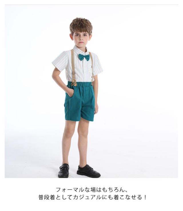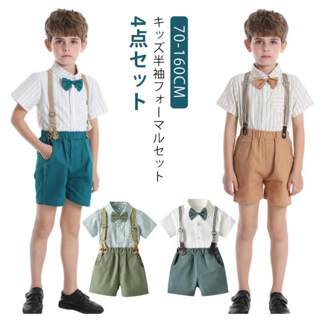 シャツ 結婚式 男の子 半ズボン スーツ 発表会 サスペンダー 蝶ネクタイ 4点セット 半袖 140 フォーマル 子供 男の子 70 子供服 上下セット ハーフパンツ 80 90 100 ベビー 120 130 110 150 160 cm 夏 涼しい おしゃれ ストライプ チェック 赤ちゃん 小学生