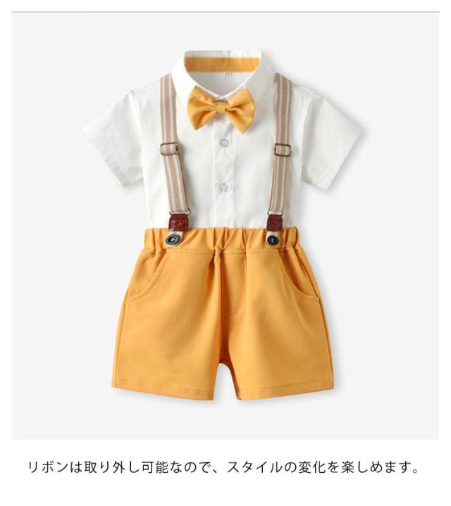 | キッズ半袖フォーマルセット 4点セット 70-160cm 人気のキッズスーツに 暑い季節にもぴったりの 半袖&ハーフパンツスタイルが登場! フォーマルな場はもちろん、 普段着としてカジュアルにも着こなせる! お子様のお洒落さと機能を重視したデザインで、結婚式、入園式、 お祝いなどのフォーマルシーンはもちろん、発表会の衣装としても! やんちゃな僕も英国紳士のようにスマートに大変身♪ サイズ展開は赤ちゃんからお兄さんまで。 兄弟や、お友達とお揃いも素敵ですね♪ <お勧めポイント> 1.きっちり感がありつつ、カジュアルにも着やすい。 2.リボンは取り外し可能なので、スタイルの変化を楽しめます。 3.ウエストゴムなので、着替えも楽ちんです。 4.綿混素材なので肌触りが良く吸水性に優れているので汗をかいても快適。 | |