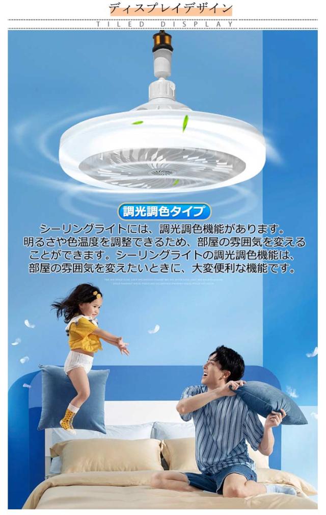 | LED照明と扇風機が一体になった小型のシーリングライトファン。ライト+サーキュレーターでトイレや脱衣所などの換気や送風に。明るさ無段階と風量3段階は全てリモコン操作OKです。 【調光調色タイプ】シーリングライトには、調光調色機能があります。明るさや色温度を調整できるため、部屋の雰囲気を変えることができます。シーリングライトの調光調色機能は、部屋の雰囲気を変えたいときに、大変便利な機能です。 【無階段調光/3階段調色】照明の色は、3色に変更できます。 【風量3段階調節可能】使用シーンに合わせて3段階幅広いに調整可能です。 【タイマー機能】就寝時や外出時に自動的に運転を操作してくれ安全安心! 【更に!色々な場合で大活躍!】熱がこもりやすい空間に最適!不快な暑さも和らげます。 【取り付け簡単】引っ掛け装置とシーリングライト本体は揺れないようにしっかり取り付けられていて、2ステップで簡単に取り付けられ、面倒な電気工事を必要としません! | |