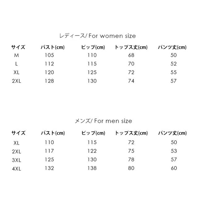 | サイズ | M(レディース) L(レディース) XL(レディース) 2XL(レディース) XL(メンズ) 2XL(メンズ) 3XL(メンズ) 4XL(メンズ) |