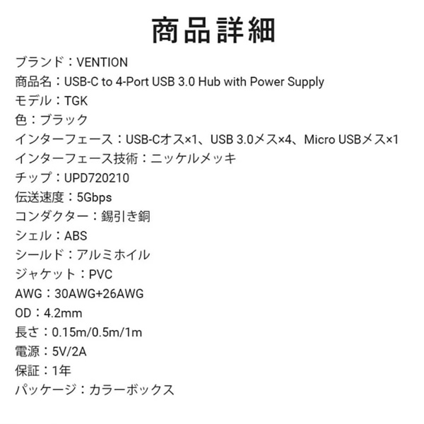 USB Type-CからUSB3.0を4つ接続できるUSBハブです。 セルフパワー、バスパワー両方に対応します。 ■ブランド:VENTION ■色:ブラック ■インターフェース:USB-Cオス×1、USB 3.0メス×4、Micro USBメス×1 ■インターフェース技術:ニッケルメッキ ■チップ:UPD720210 ■伝送速度:5Gbps ■コンダクター:錫引き銅 ■シェル:ABS ■シールド:アルミホイル ■ジャケット:PVC ■AWG:30AWG+26AWG ■OD:4.2mm ■長さ:0.15m ■電源:5V/2A ※記載は商品仕様の一部です。仕様説明不足等の理由での返品はできません。特に適合等は必ずご確認ください。