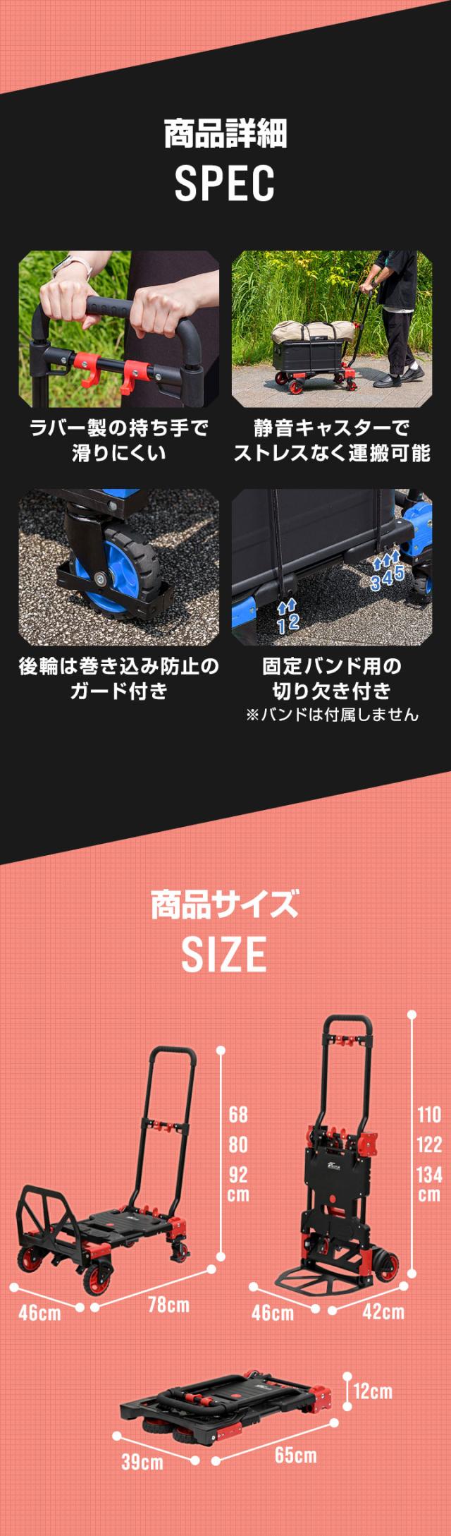 | サイズ: 4輪時:(約)幅46×奥行78cm×高さ68/80/92cm 2輪時:(約)幅46×奥行42cm×高さ110/122/134cm 折りたたみ時:(約)幅39×奥行65cm×高さ12cm |