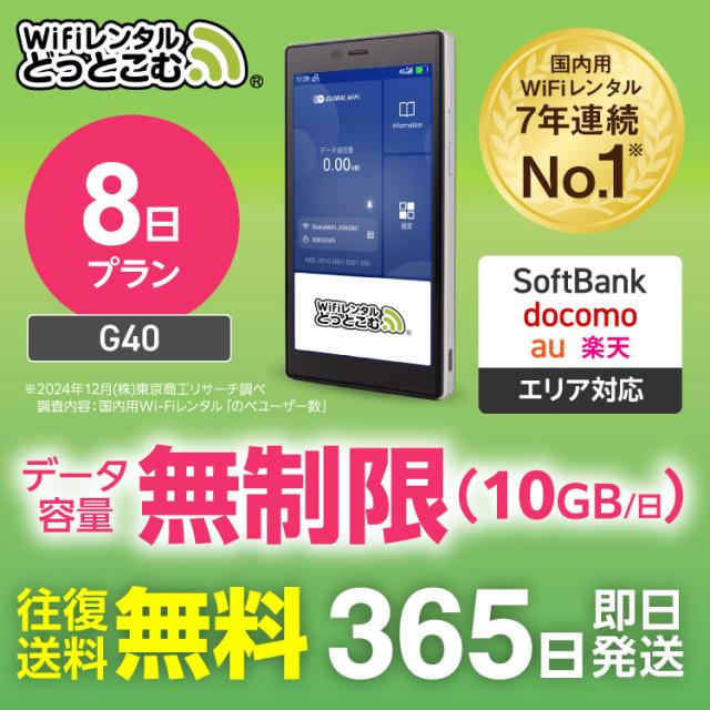 ポケットwi-fi レンタル 無制限 8日 G40 1日10GB 日本国内専用 往復送料無料 即日発送 ソフトバンク 空港 受取 wi-fi ルーター