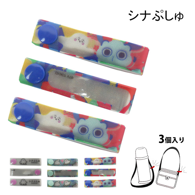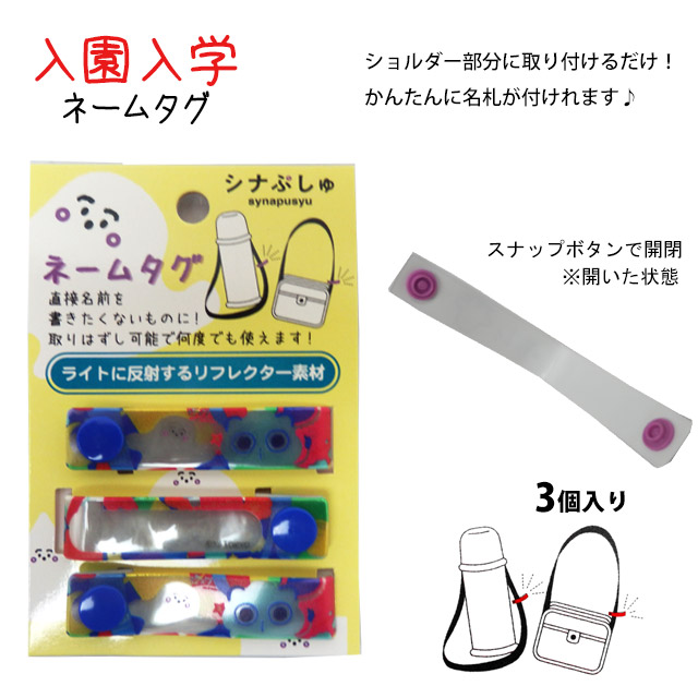 | 商品説明 | かばんや手提げ、ポット等のお名前付けに便利なループ状になるネームタグです。 油性ペンで名前を書き、バッグなどに取り付け スナップ式なので取り外し楽々! 急な追加お名前つけにも便利ですよ 直接名前を書きたくない物にも最適! 取り外して何度でも使えます ライトに反射するリフレクター素材 同柄3個セット 柄:シナぷしゅ |