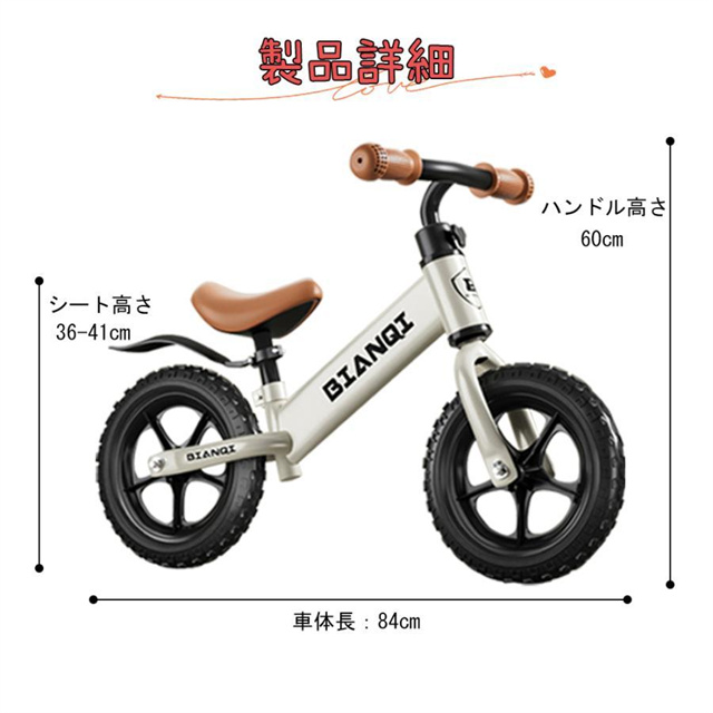 グリップエンドは衝撃吸収性が高く、転倒時の衝撃を和らげお子様の手をしっかり守ります。高品質のノーパンクタイヤ装備、メンテナンス不要で、耐久性に優れる!地面からの衝撃も抑えるます。