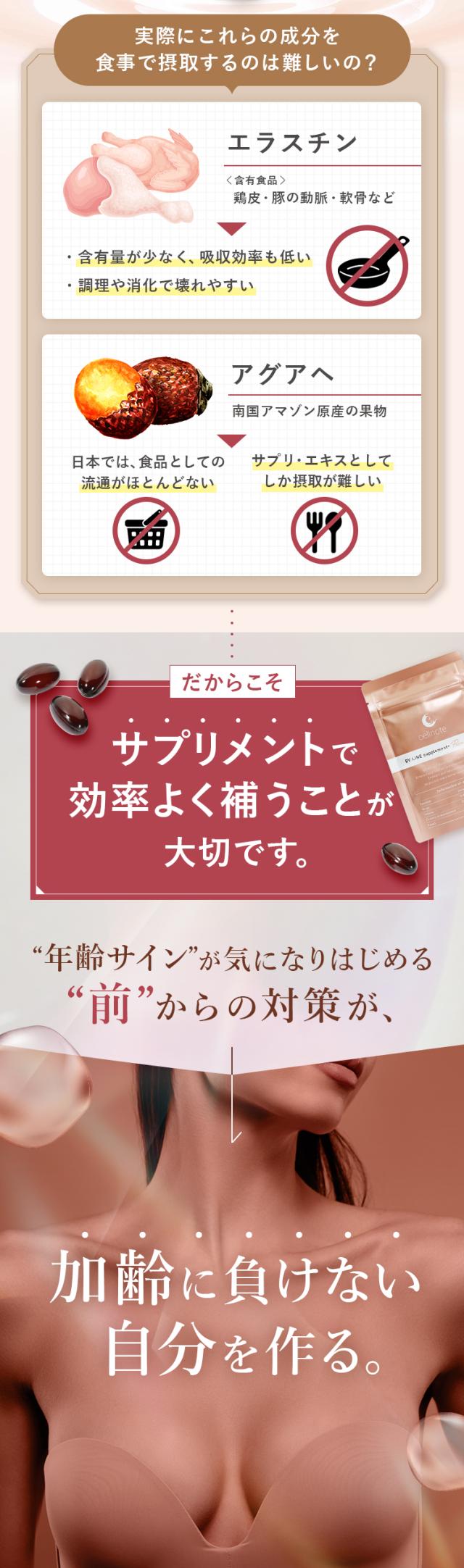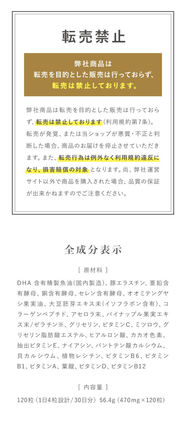 | 成分 | DHA含有精製魚油(国内製造)、豚エラスチン、亜鉛含有酵母、銅含有酵母、セレン含有酵母、オオミテングヤシ果実油、大豆胚芽エキス末(イソフラボン含有)、コラーゲンペプチド、アセロラ末、パイナップル果実エキス末/ゼラチン※、グリセリン、ビタミンC、ミツロウ、グリセリン脂肪酸エステル、ヒアルロン酸、カカオ色素、抽出ビタミンE、ナイアシン、パントテン酸カルシウム、貝カルシウム、植物レシチン、ビタミンB6、ビタミンB1、ビタミンA、葉酸、ビタミンD、ビタミンB12 |