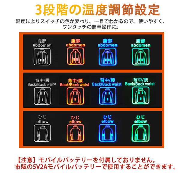 ■電源ボタンを長押し(約3秒間)して電源を入れて下さい。その時に、赤色点滅になり、ジャケットは予熱中です。5分ほど後に、予熱完了です。スイッチのライトは白になります。