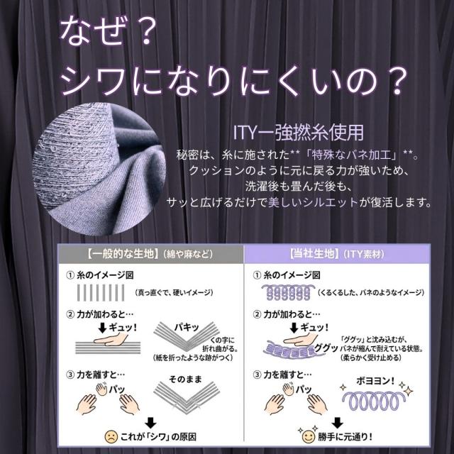 【素材】 ポリエステル95%ポリエステル5%【特徴】 長袖商品は肌の露出を控えて日焼け防止効果が期待できます。夏の紫外線カット効果が期待できます。伸縮性抜群でストレッチ素材。着脱簡単で動きやすいITY素材で糸の強度が高く、素肌のようなやわらか触り。型崩れが少なく、美しいシルエットを保ち、乾きが早くシワになりにくい着回し抜群。上品でシンプルなデザインなのでどんなボトムスにも合わせやすい注意事項 ■素材の特性上、お洗濯やクリーニングにより多少の縮みやねじれが生じる場合もございます。■商品の撮影には最大限注意を払っておりますが、閲覧時のモニター環境によりましては実際の商品と若干違うお色味に映ることもございます。