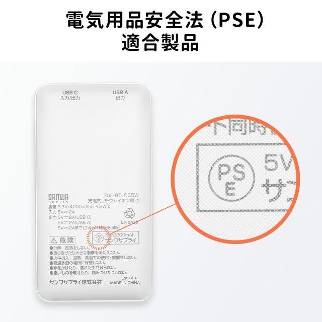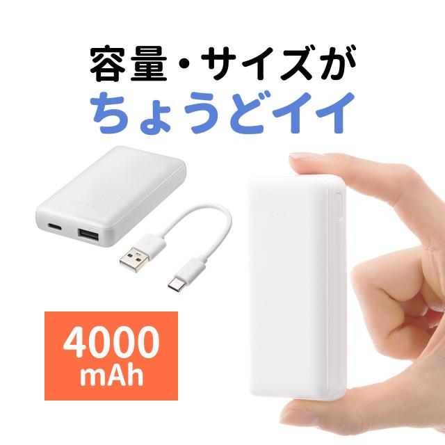 モバイルバッテリー 4000mAh 小型 軽量 Type-C×1 USB A×1 スマホ タブレット 機内持ち込み対応 PSE認証済み モバ充 ホワイト[700-BTL055W]