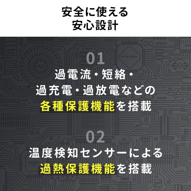●過電流、短絡、過充電、過放電と各種保護機能を搭載し安心して使用することができます。