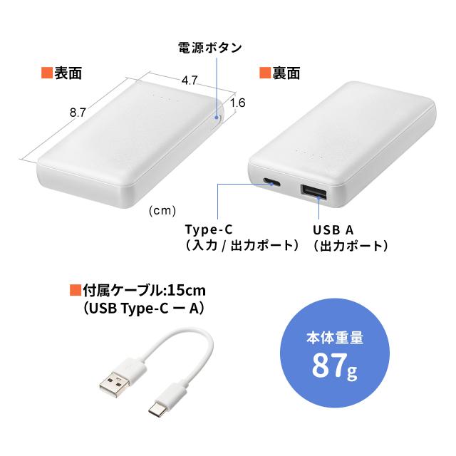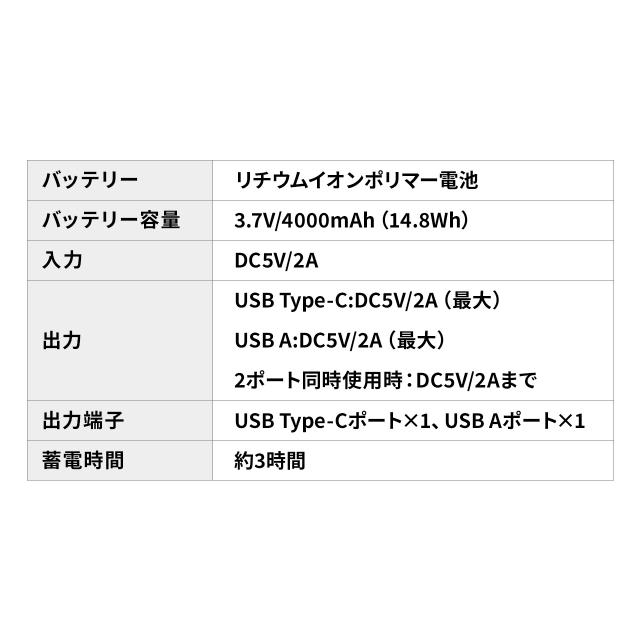 ⇒ご購入の前にご確認下さい持ち運びに便利な小型モバイルバッテリー。容量は4000mAh。Type-C×1、USB A×1を搭載。重量約87g。ホワイト。【WEB限定商品】