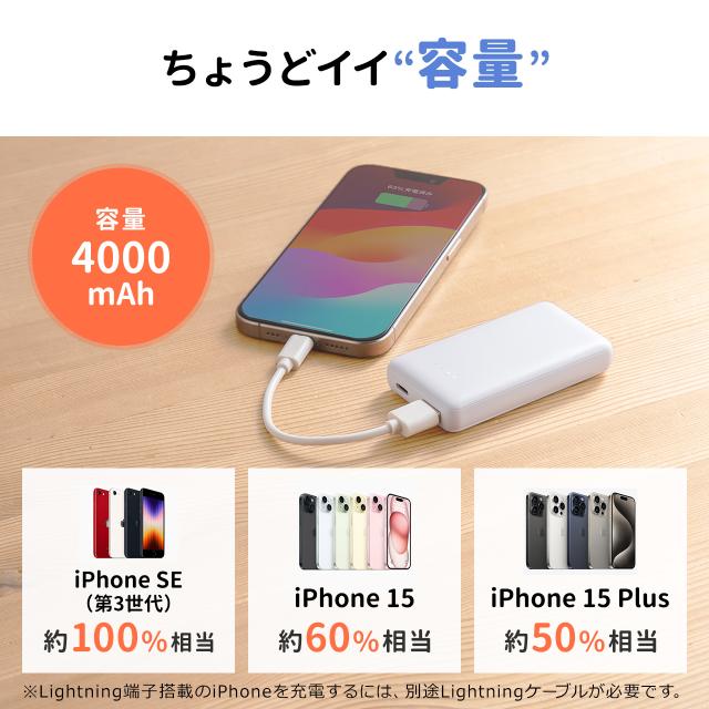 ●ちょっとしたお出かけに気軽に持ち歩ける、バッテリー容量4000mAhの小さくて軽いモバイルバッテリーです。●女性の手のひらに収まる超コンパクトサイズで、バッグやポケットに入れやすくスマートフォンとの重ね持ちもしやすいサイズ感です。